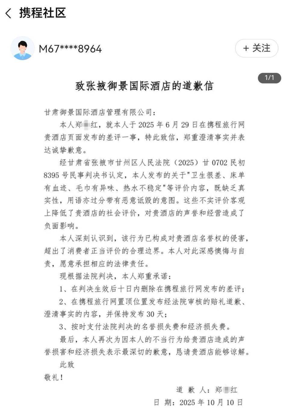 这封《致张掖御景国际酒店的道歉信》写道:本人郑某红,就本人于2025年6月29日在携程旅行网贵酒店页面发布的差评一事,特此致信,郑重澄清事实并表达诚挚歉意。